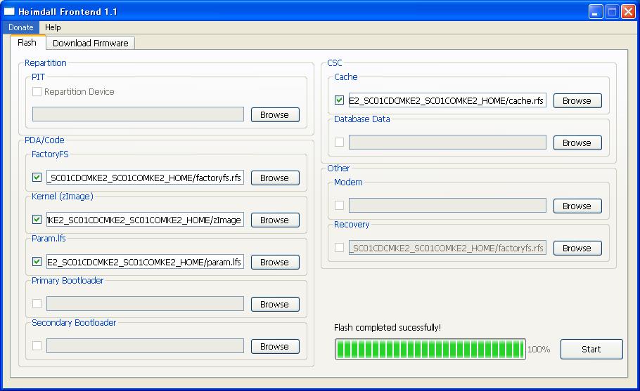 画像のようにHeimdall Frontend 1.1に設定してstart! 無事に焼けました。